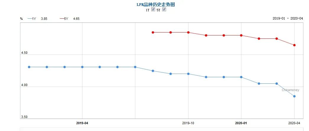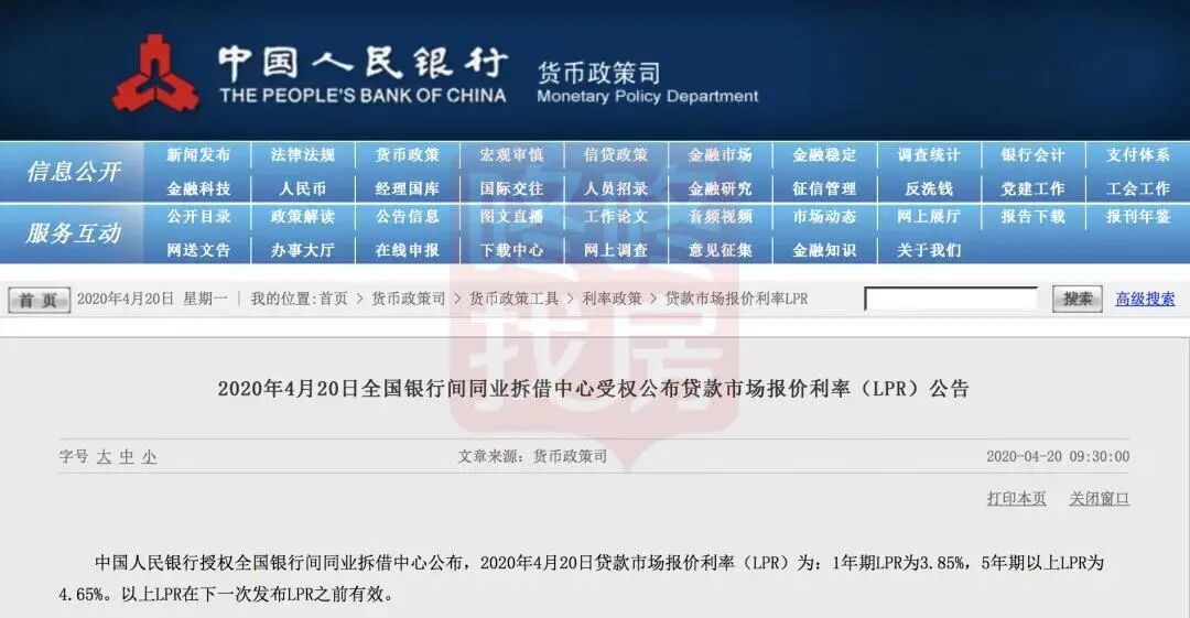 2020年4月20日,LPR第九次报价显示,1年期LPR为3.85%,较上次下调20个基点;5年期以上LPR为4.65%,较上次下调10个基点。